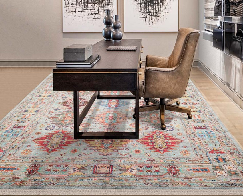 Ideal para crear un punto focal en oficinas, despachos, salones o incluso dormitorios, esta alfombra no solo embellece el entorno, sino que también ayuda a delimitar zonas y aportar una sensación de calidez y confort. Su presencia transforma el ambiente en un lugar más acogedor y estilizado, sin necesidad de recargar el espacio.