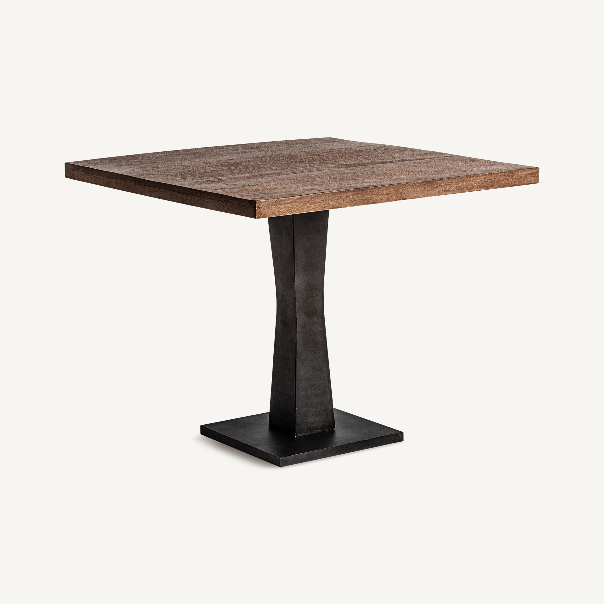 La fuerza estética de esta mesa reside en su equilibrio entre robustez y calidez. La madera aporta textura y un acabado acogedor, mientras que el hierro negro introduce un matiz más urbano y contemporáneo. El resultado es una pieza capaz de transformar el ambiente sin recargarlo, aportando carácter y sofisticación a partes iguales.