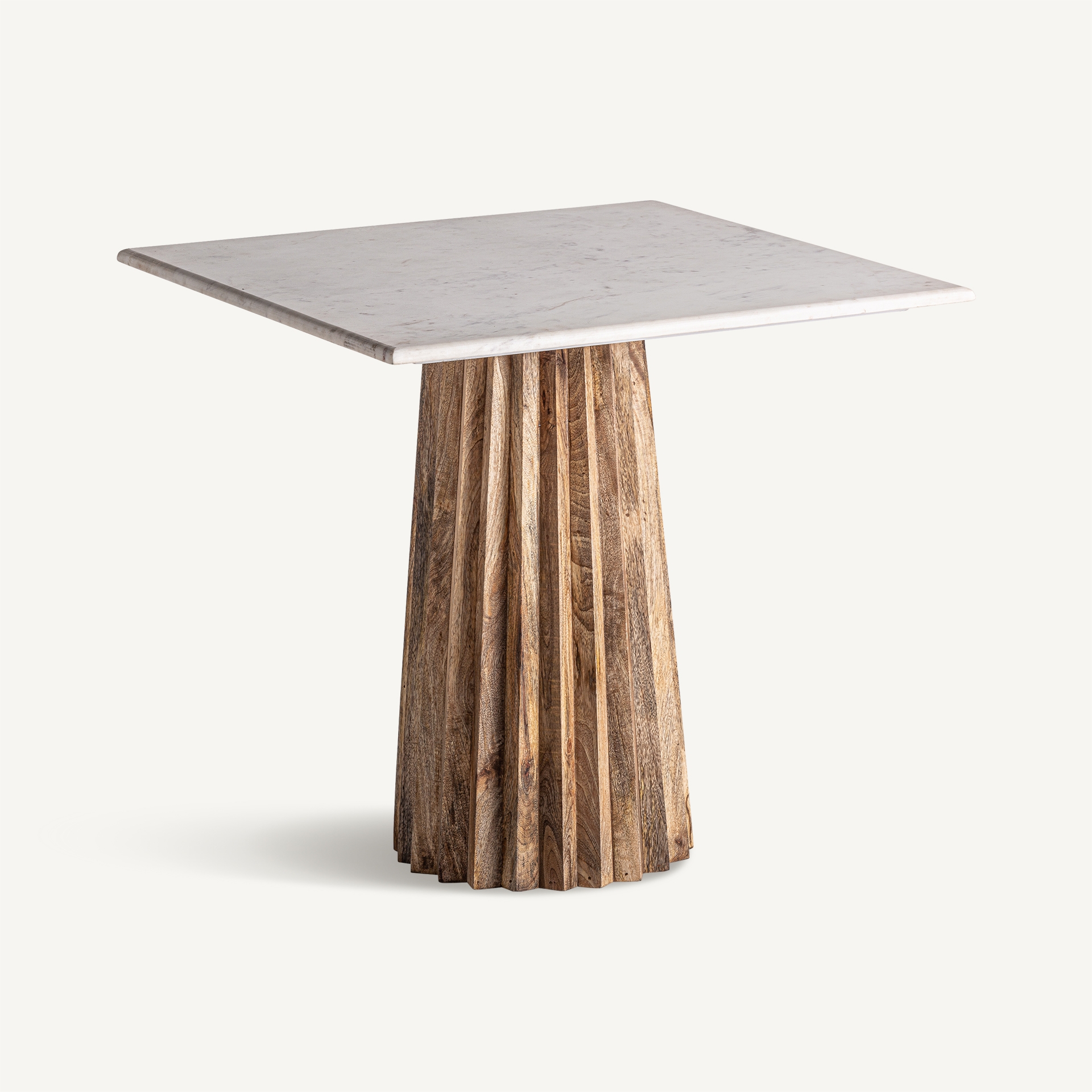 La mesa de bar Plissé Wood está disponible en dos versiones. La variante negra tiene unas dimensiones de 80 cm de ancho, 80 cm de fondo y 75 cm de alto. La versión en madera natural y mármol blanco presenta 80 cm de ancho, 80 cm de fondo y 77 cm de alto.