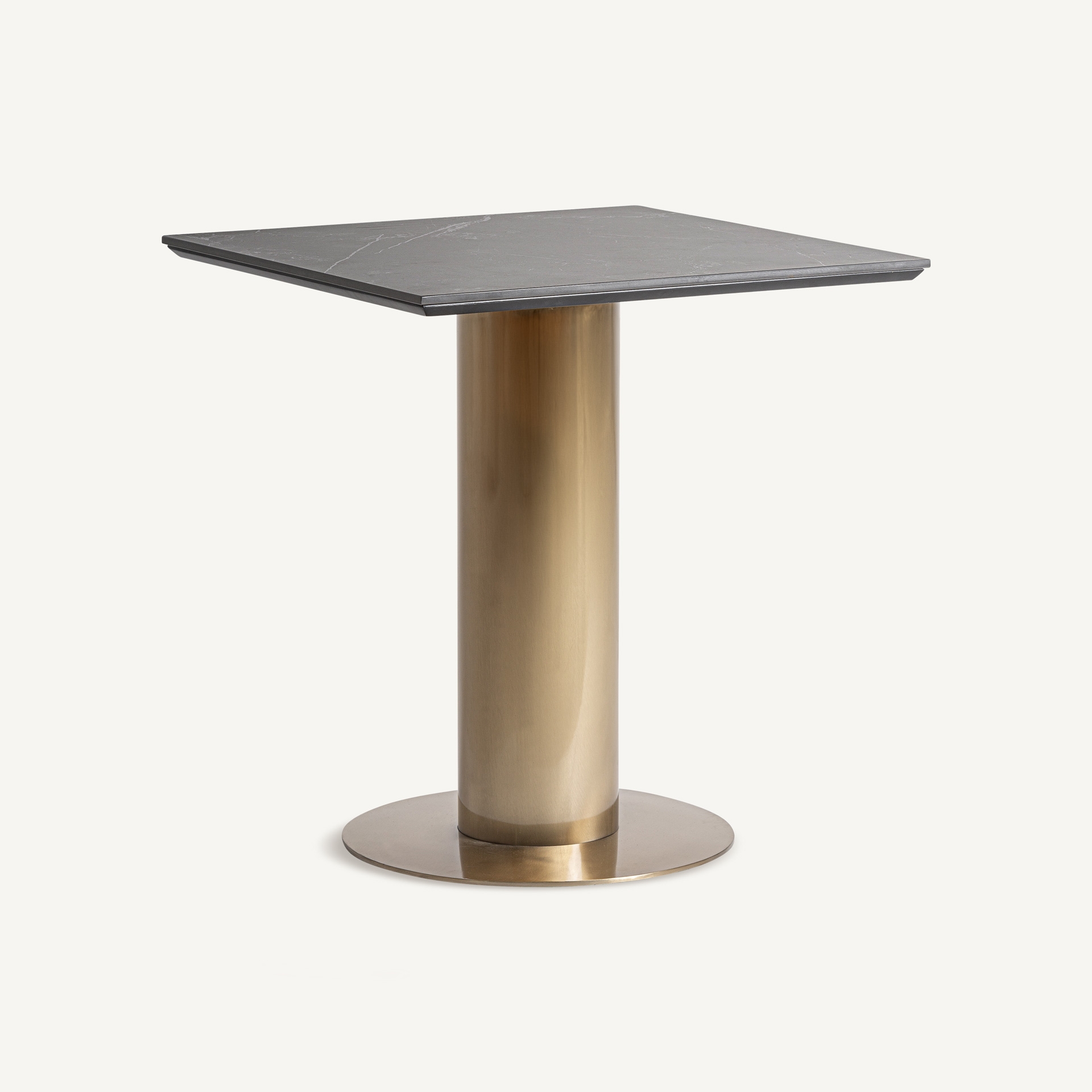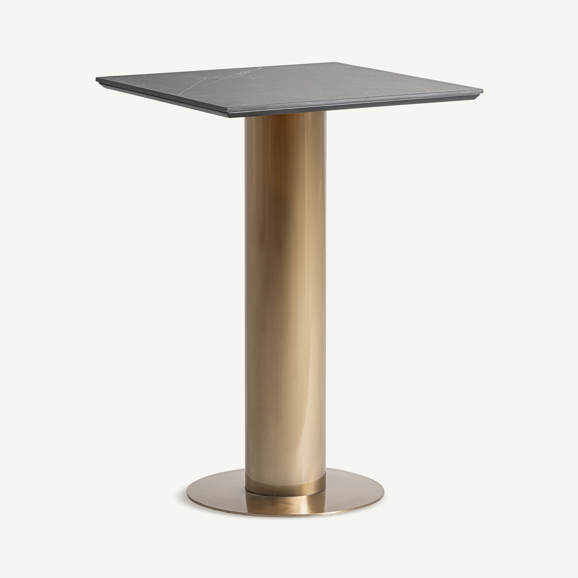 La Mesa Bar Tasque de Vicalhome es una reinterpretación contemporánea del estilo art déco, donde la geometría depurada y la nobleza de los materiales se funden en una pieza de gran impacto visual. Su estructura cilíndrica en acero acabado en oro aporta verticalidad y elegancia, mientras que el sobre cuadrado en porcelánico negro introduce un contraste sofisticado y altamente resistente.