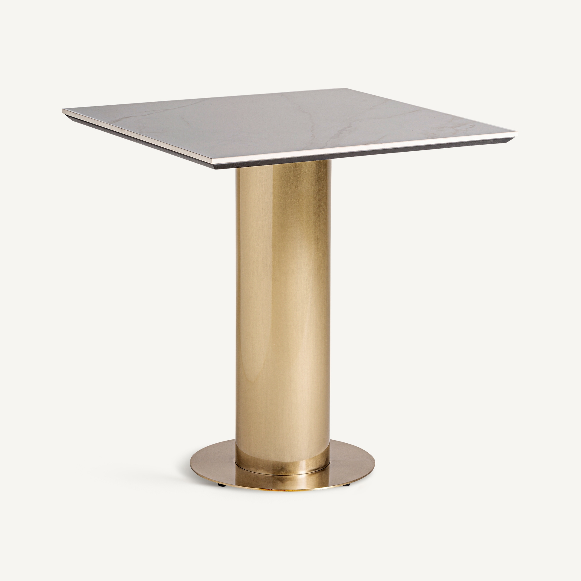 La mesa de bar Naustdal de Vicalhome destaca por una estética depurada que combina equilibrio visual y elegancia decorativa. Su diseño de formato cuadrado favorece una presencia ordenada y arquitectónica, mientras que la combinación de acero en color blanco y sobre de porcelánico en color oro refuerza su carácter distinguido.