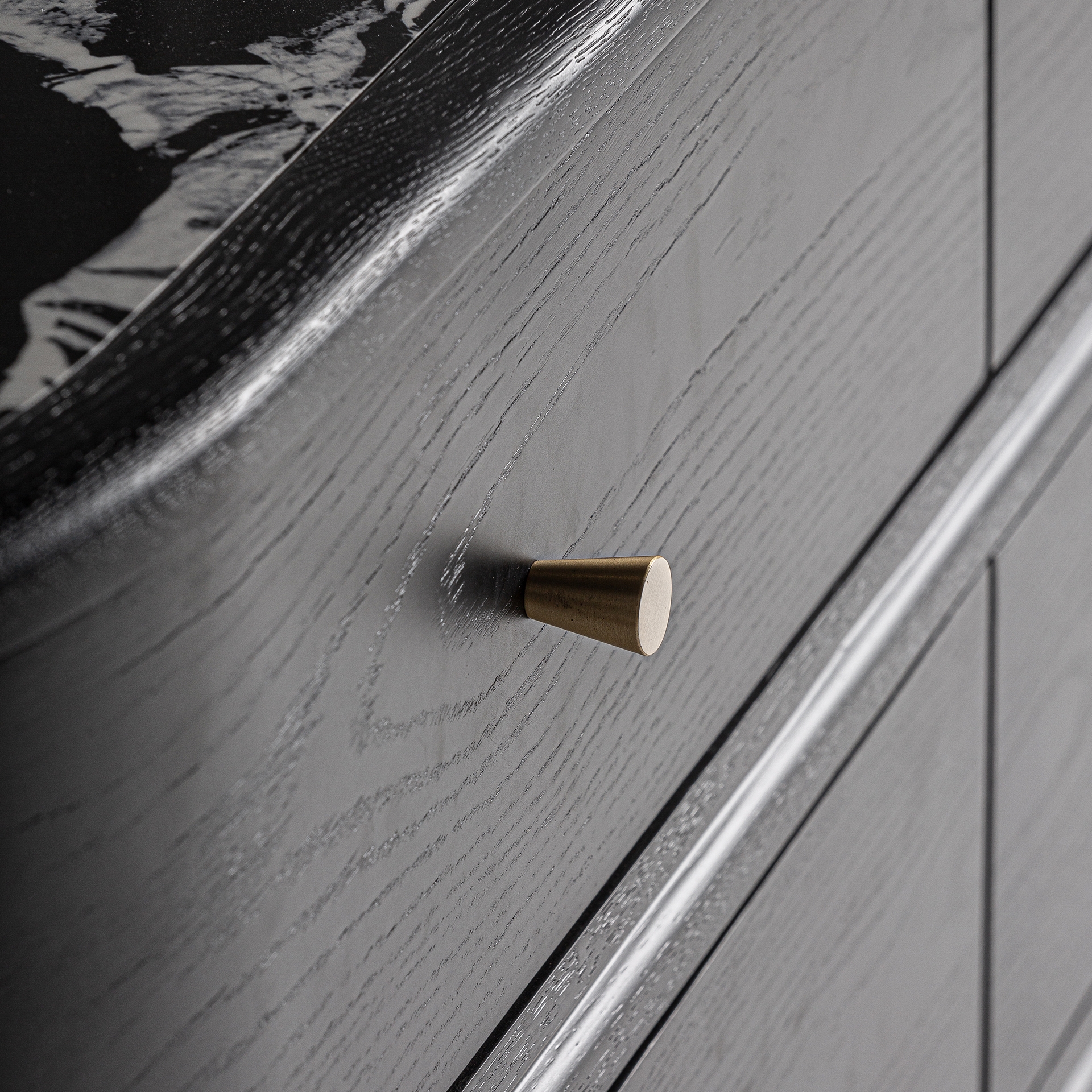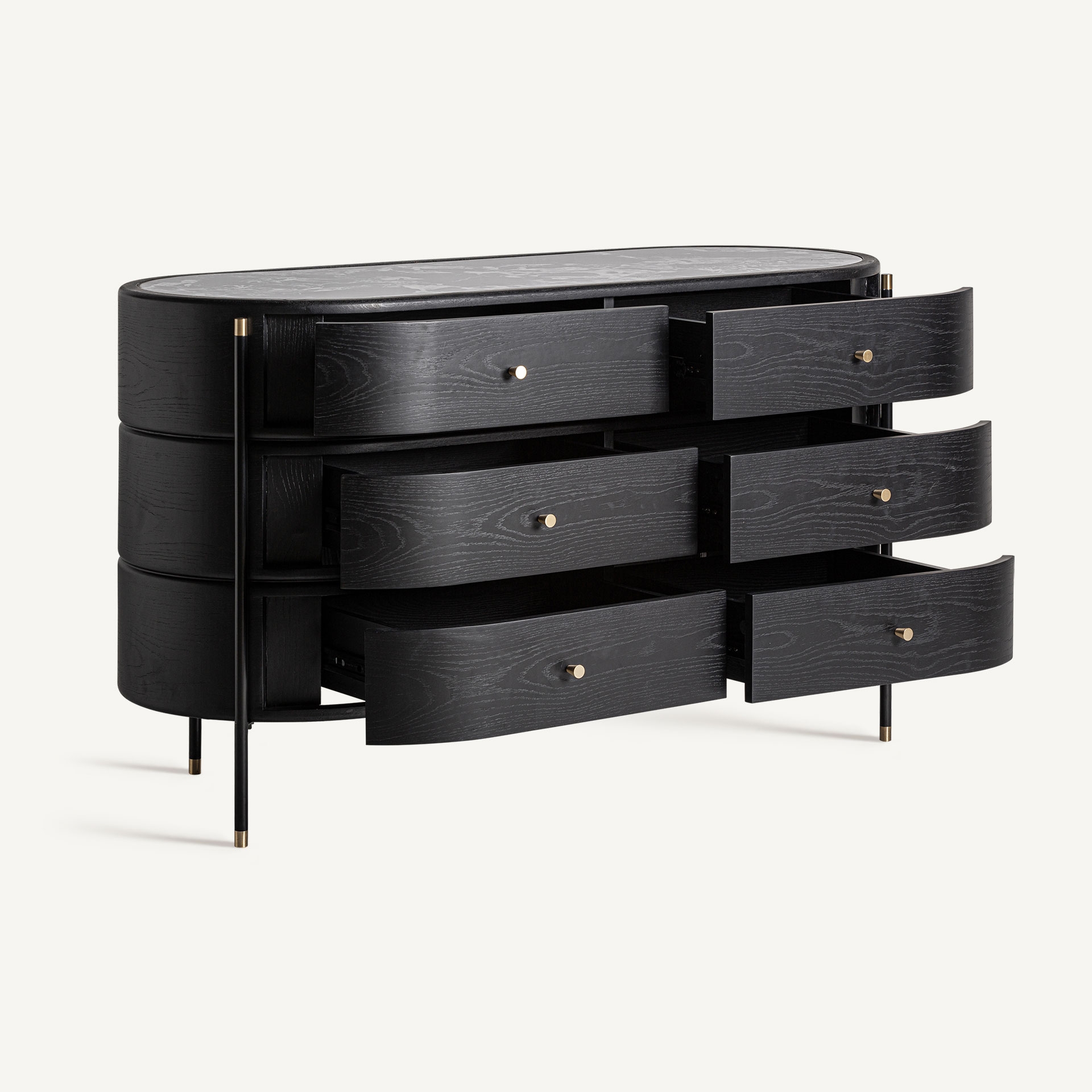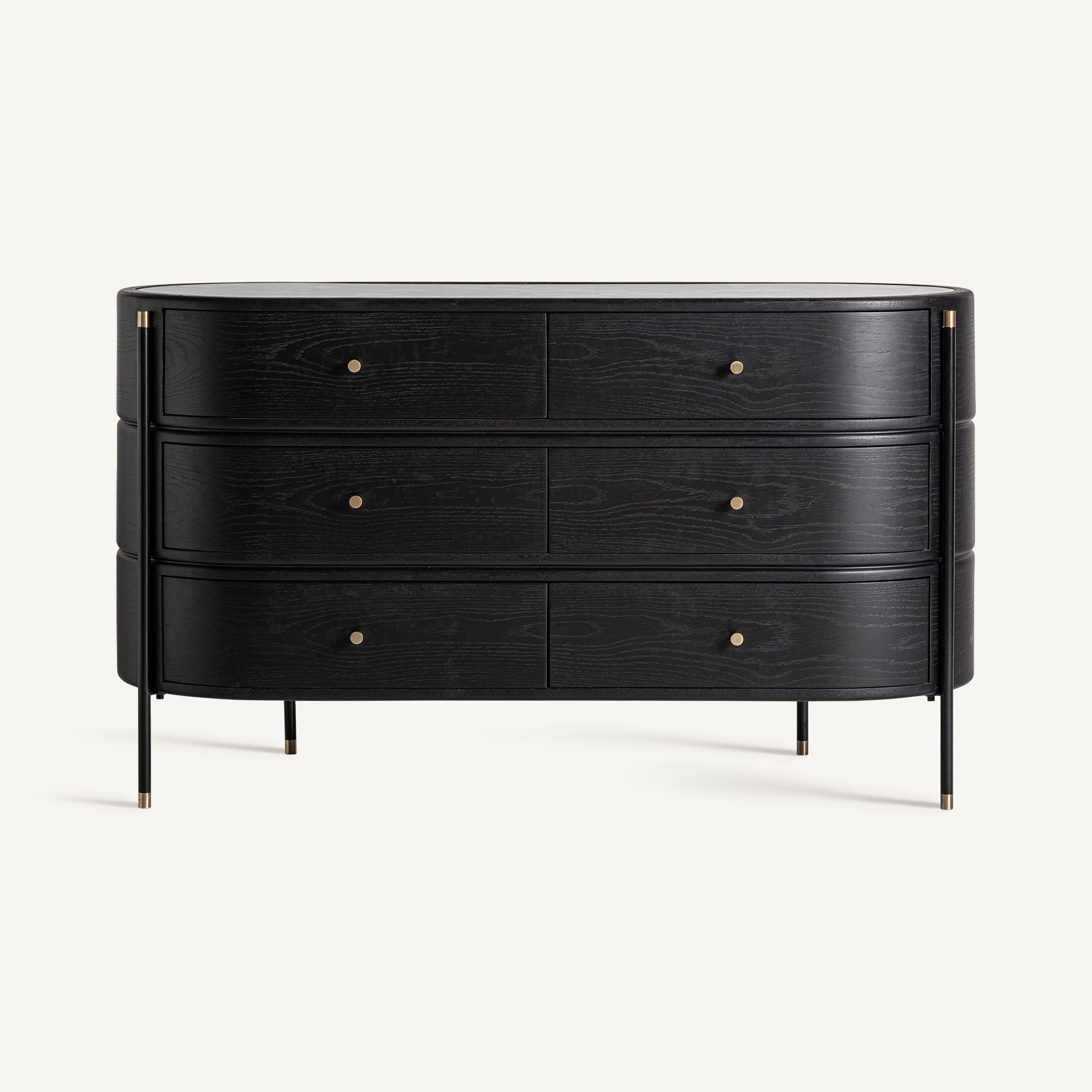La Cómoda Bilzen destaca por su tonalidad acabado en negro ahumado, una tonalidad que realza la veta natural de la madera y aporta profundidad visual al mueble. Este color, combinado con los sutiles detalles metálicos en dorado satinado, crea un contraste sofisticado que ilumina la pieza sin perder su carácter sobrio. El resultado es una estética equilibrada que encaja perfectamente en interiores modernos, ambientes minimalistas o espacios donde se busque un toque de distinción contemporánea.