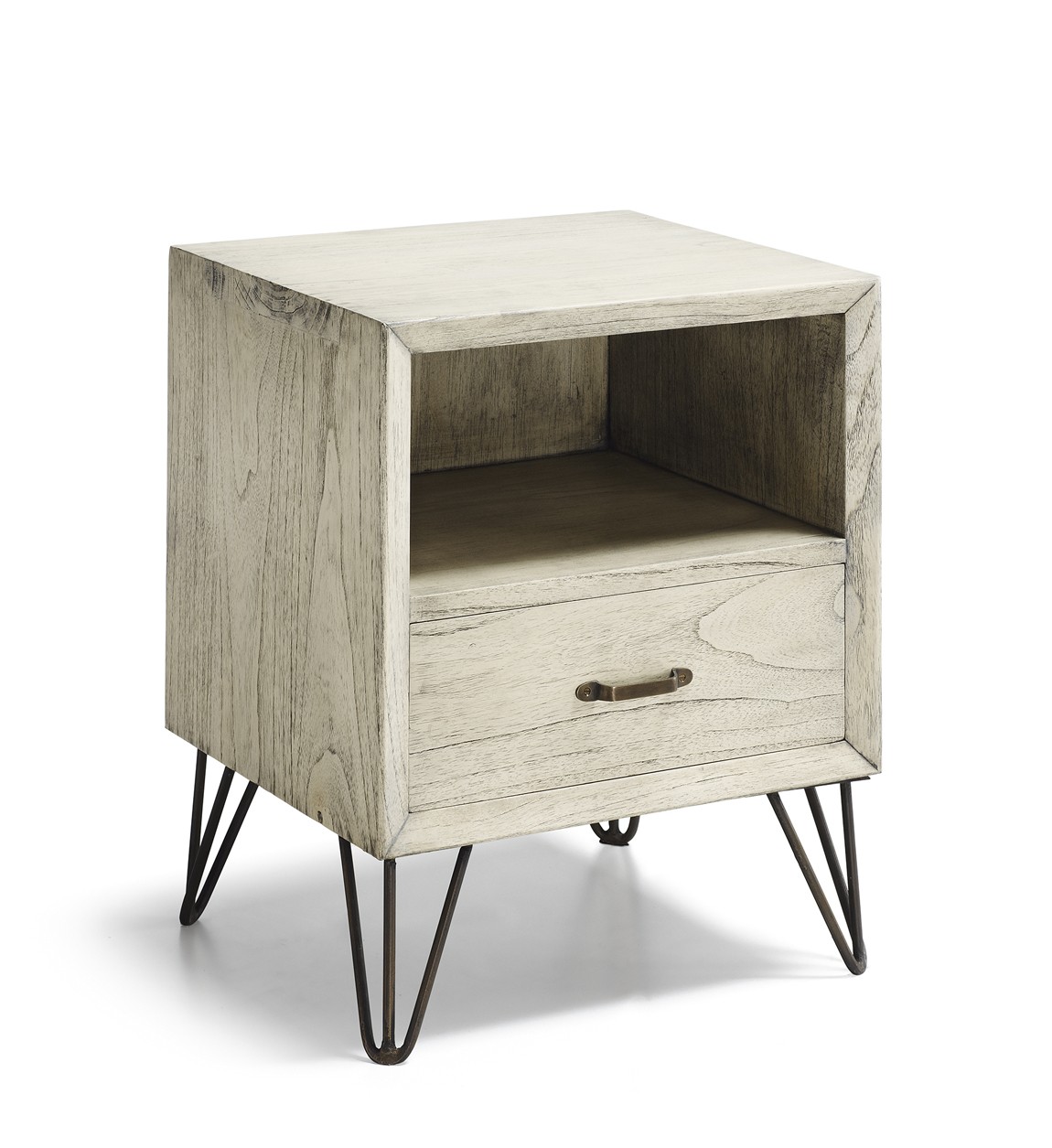 Mesita de noche con cajón y hueco superior. Originales patas metálicas que le dan un toque industrial sin perder su esencia
