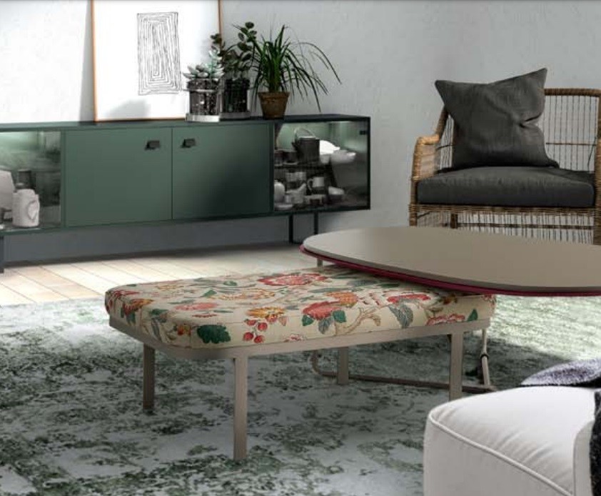 Puff tapizado Loft Fusion que sirve como complemento de mesa de centro o auxiliar para nuestro sofá. Tapizados diferentes y exclusivos que consiguen una pieza con gran personalidad